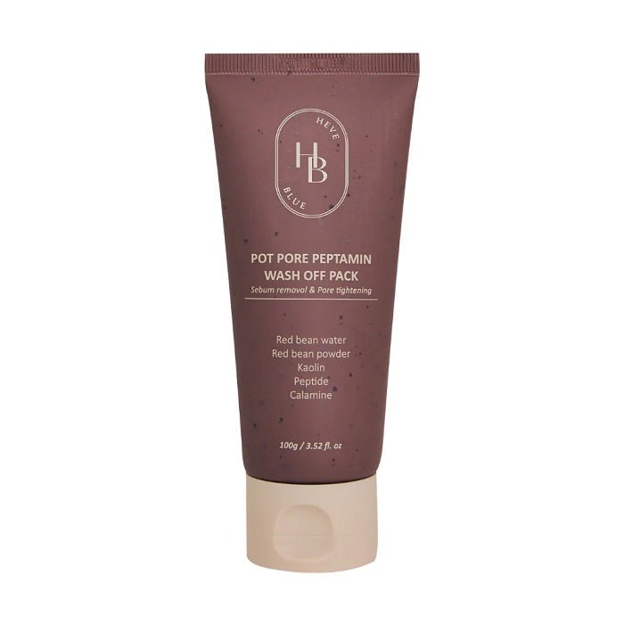 HEVEBLUE Pot Pore Peptamin Wash Off Pack este o mască tip cremă, formulată pentru a curăța și a strânge porii, îmbunătățind textura pielii. Această mască conține apă de fasole roșie (438.800 ppm) și pulbere de fasole roșie (10.000 ppm), oferind o exfoliere delicată și o hidratare profundă. Tehnologia Peptamin, care combină peptidele cu calamina, ajută la îmbunătățirea elasticității pielii și la reducerea aspectului porilor dilatați.