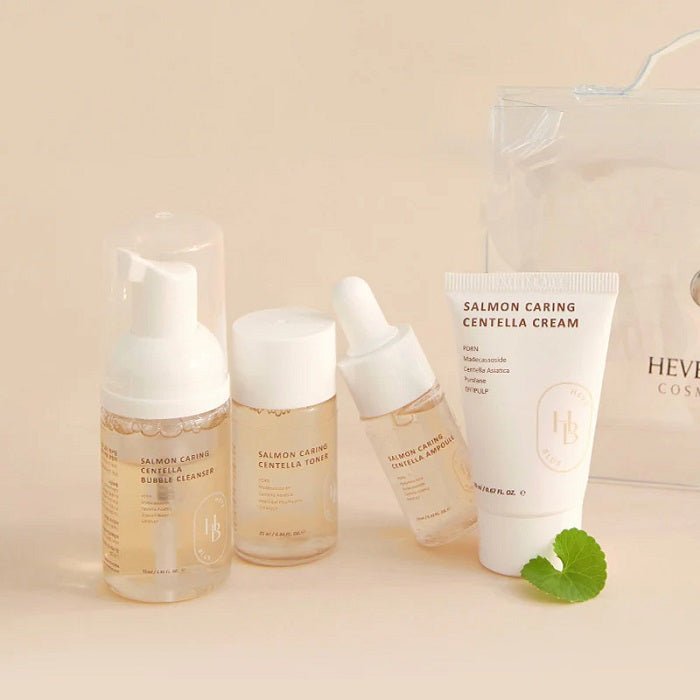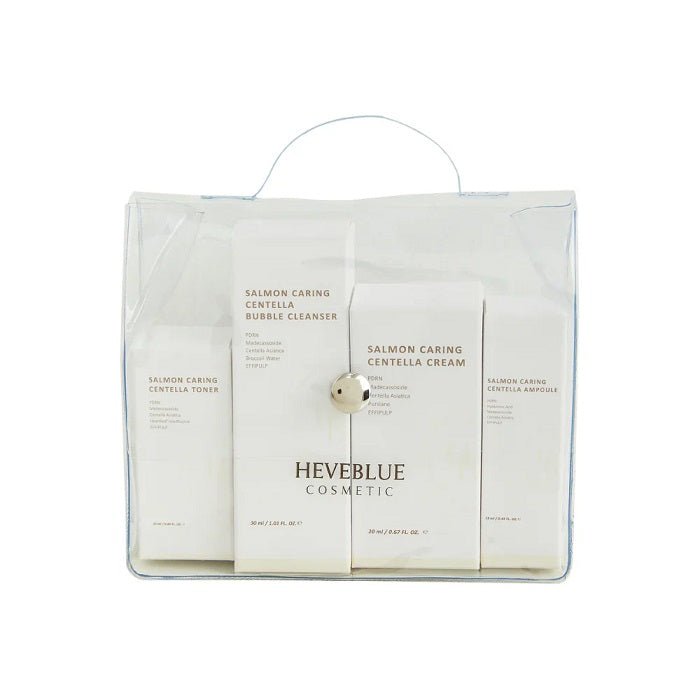 Setul HEVEBLUE Salmon Caring Centella Special Travel Kit Bag este o soluție completă de îngrijire a pielii, perfectă pentru călătorii sau pentru a încerca rutina Salmon Caring într-un format compact. Acesta include patru produse esențiale, toate formulate cu ingrediente calmante și hidratante, ideale pentru pielea sensibilă sau stresată.