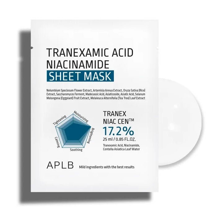 APLB Tranexamic Acid Niacinamide Sheet Mask este o mască facială hidratantă și iluminatoare, formulată cu un complex activ Tranex Niac Cen™ (17,2%), care combină tranexamic acid, niacinamidă și apă de frunze de Centella Asiatica. Este ideală pentru tenul tern, cu pete pigmentare sau sensibil. Masca uniformizează tonul pielii, reduce roșeața și calmează iritațiile, lăsând pielea hidratată, revitalizată și luminoasă.